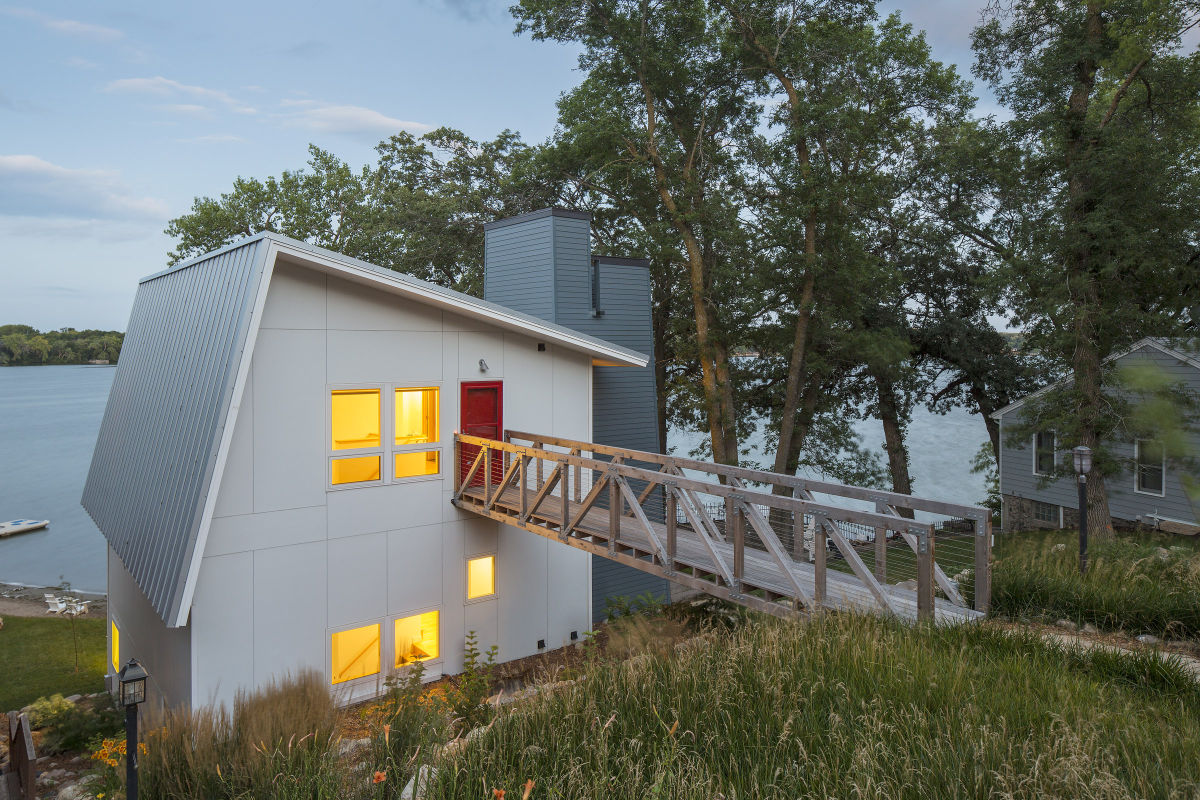 We’ve designed two cabins on the steep slopes along the western shore of Pickerel Lake in northeast South Dakota. Both involve entering at the top of a three level structure. In each the entry level features bedrooms and the middle level is living space. An additional bedroom and beach equipment storage is on the lake level. Each has an eastern deck off the middle level with panoramic views over the lake. The Mother’s Place project is designed to reflect the family tradition of life on Pickerel Lake. It’s banked into the hill in such a way to access the structure directly from atop the hill.