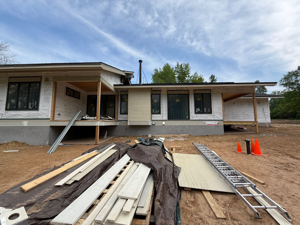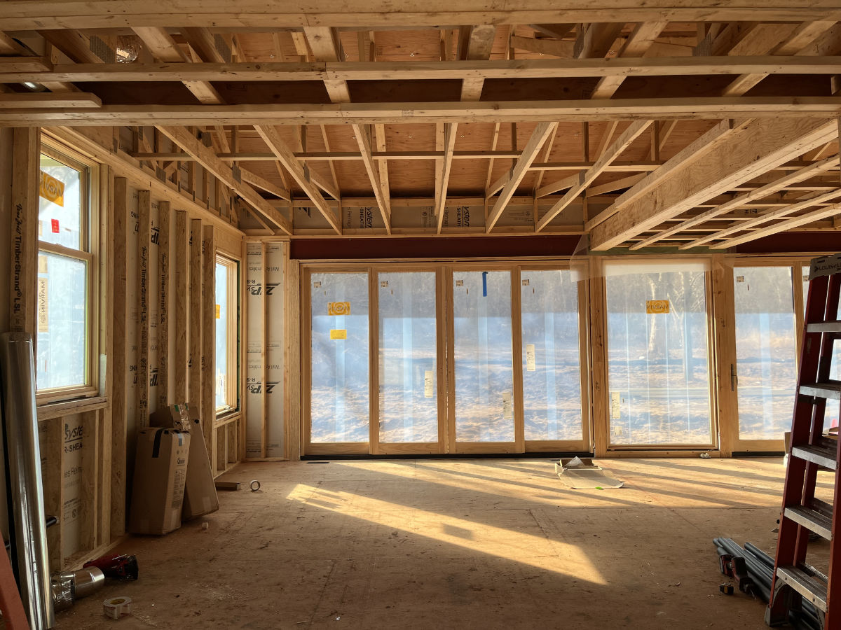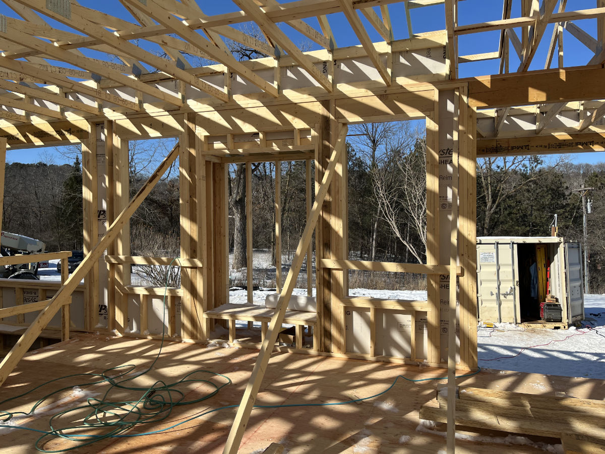 This first phase of construction is thrilling and fast, maybe even a bit nerve-wracking. It’s mind-boggling to witness skilled hands translate our 24” x 36” sheets of paper to full scale, and we are so grateful for their dedication and precision. As the walls go up and the trusses are set in place, you start to get a sense of the scale and form. For this project, a stepped series of gables define the progression from public to private and create in-between spaces with roof-covered porches that seasonally extend the living spaces.