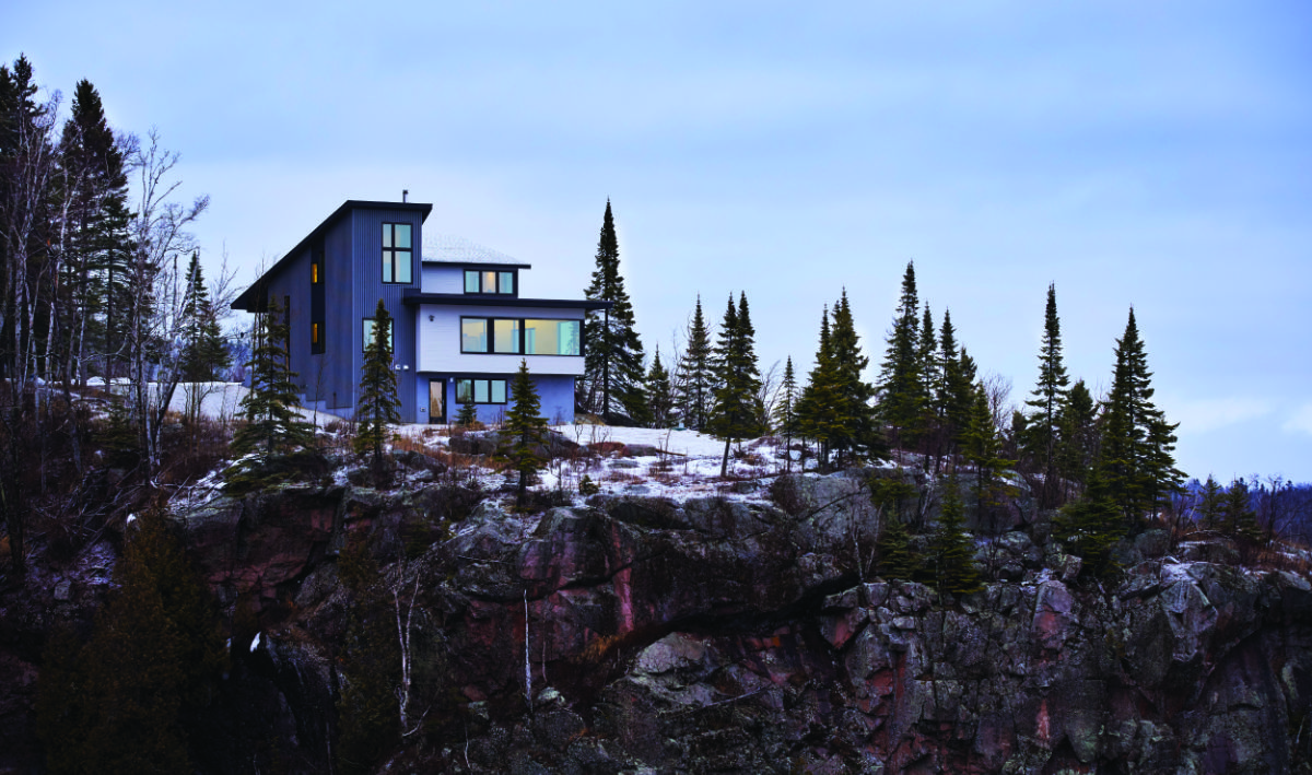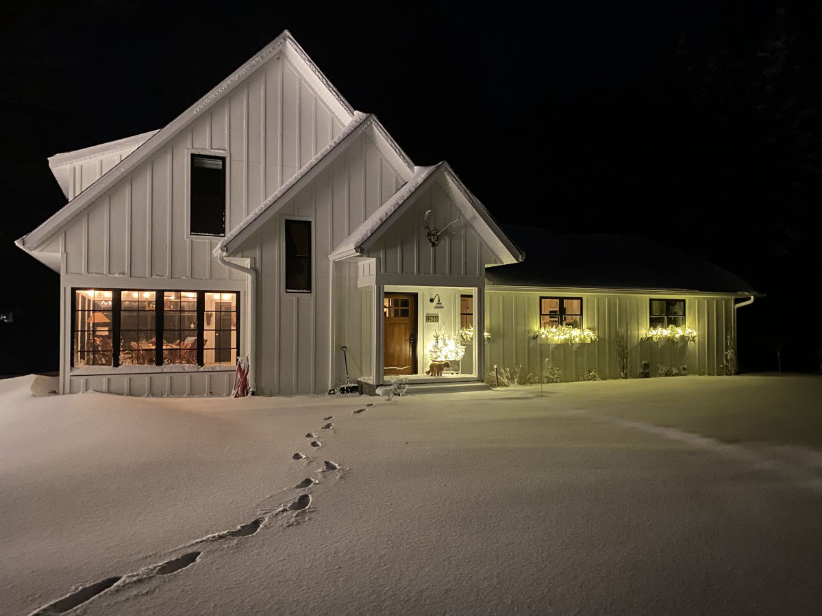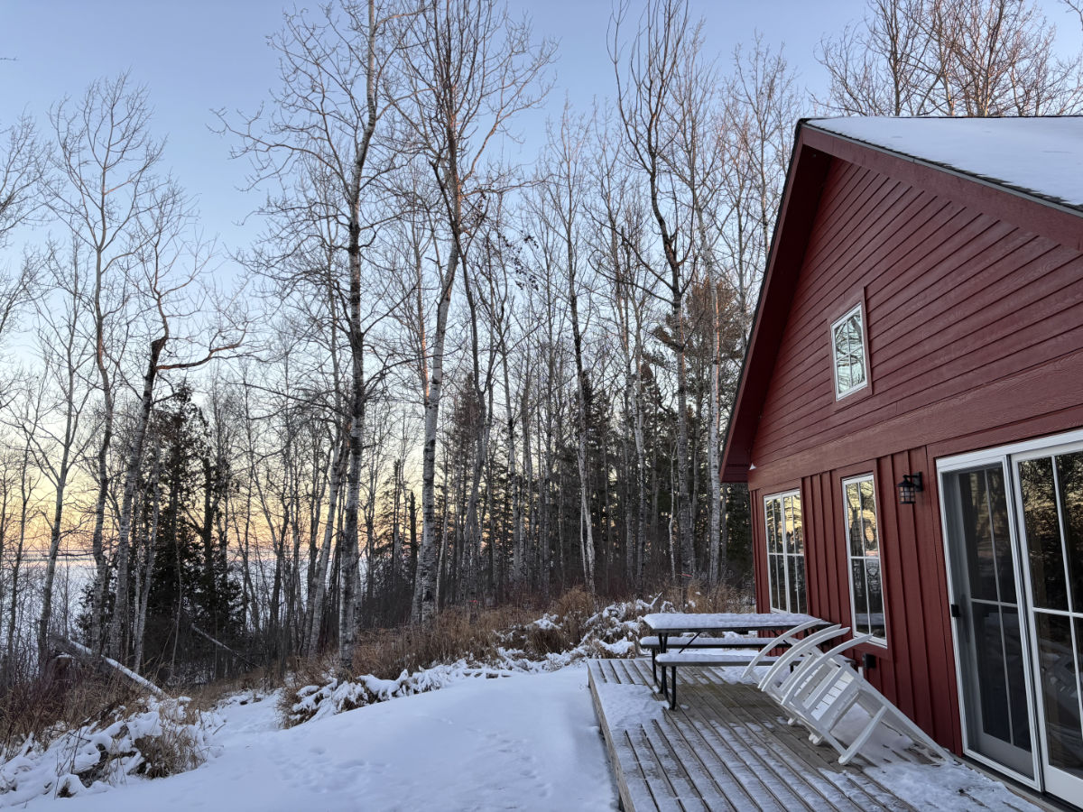 At the winter cabin, we trade the cool blue water view for the serene white of a frozen lake.