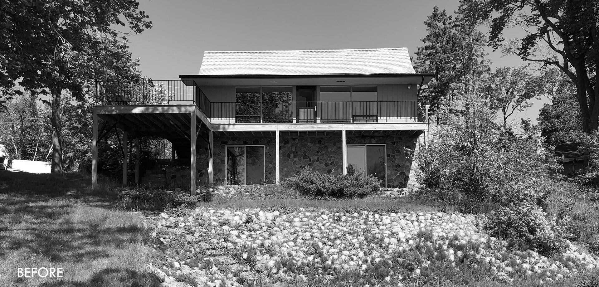 Other unique details were derived from original elements. The radius of the existing spiral stair defines a new curved landing accommodating a gentler, more accessible, stair. And lest it be forgotten, the diameter of the spiral stair was matched in a new feature window in the primary suite, creating a human-sized aperture from which to view the lake that drew her home.
